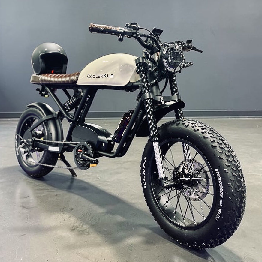 Dieser klassisch britisch inspirierte 1500-Watt-Cooler Kub ist das komfortabelste E-Bike, das Sie je gefahren sind. Mit einem breiten Motorradsattel für zwei Personen (hinten gibt es auch Fußrasten für den Beifahrer), einer Motorrad-Federbeinfederung hinten und einer Vorderradfederung ist es schnell, sparsam, macht Spaß und fährt sich wie auf Wolken.