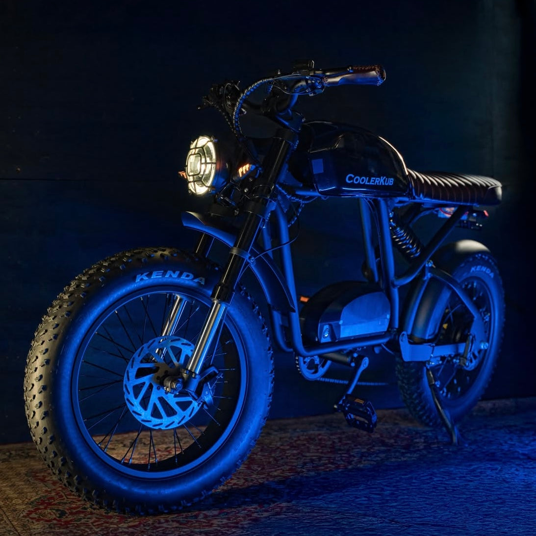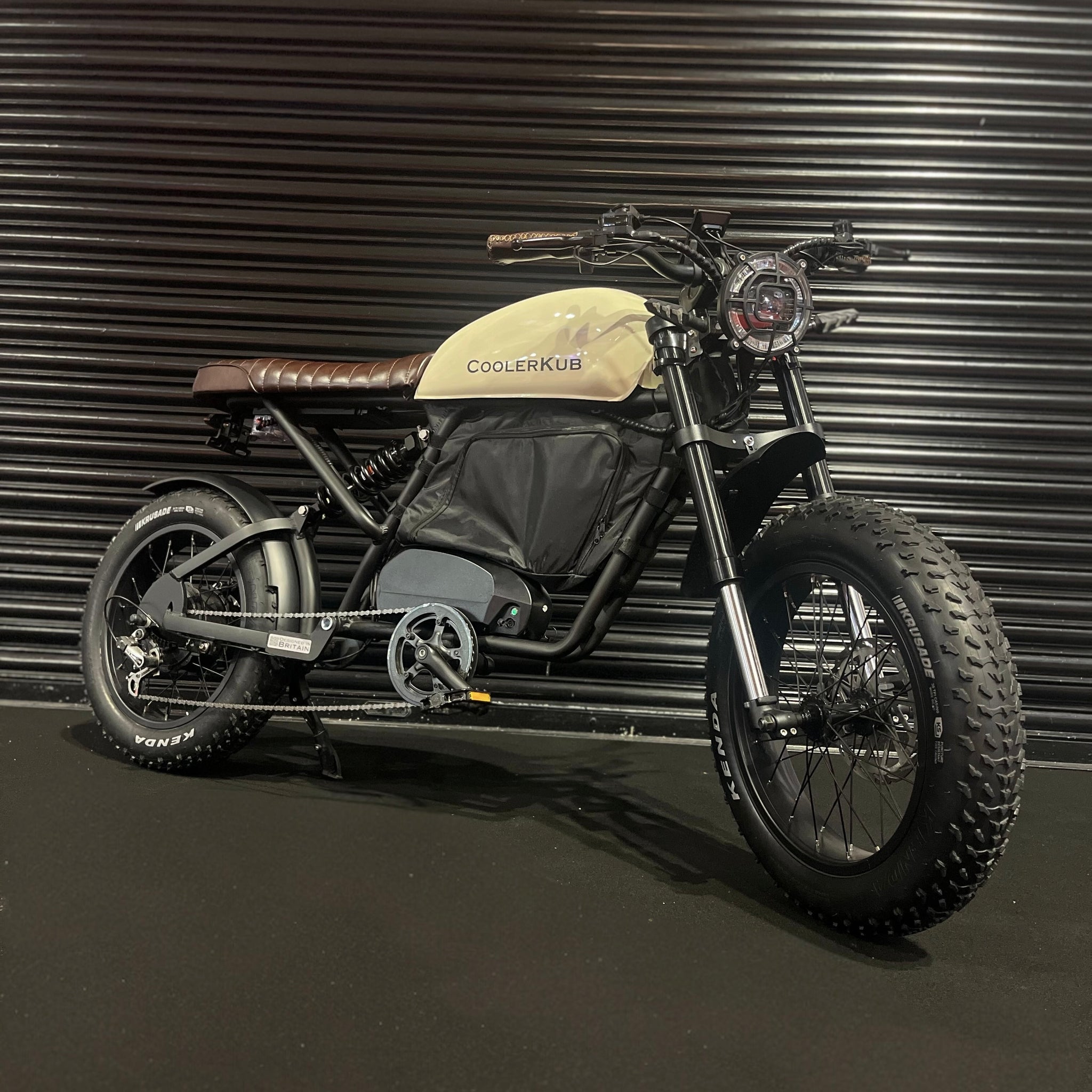 This classic British inspired 1500 watt Cooler Kub is the most comfortable ebike you've ever ridden. With a fat motorcycle saddle for two (there's rear passenger foot pegs too), motorcycle coil rear suspension and front suspension too, it's fast, frugal, fun and rides on air.